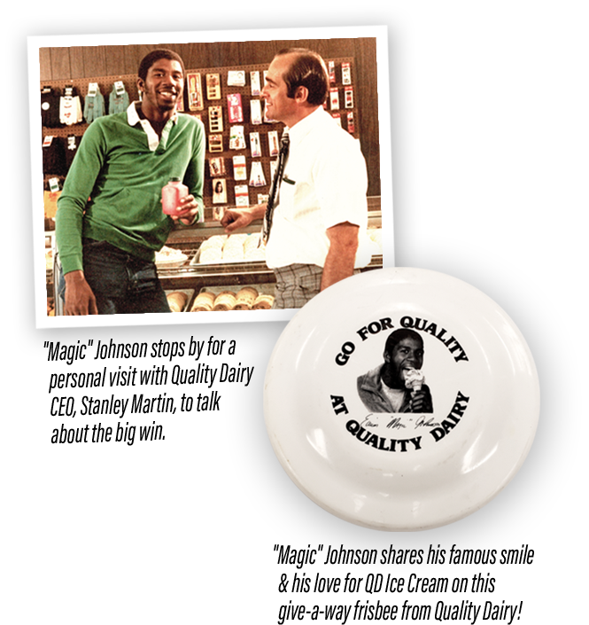 1979 was a Big Year in East Lansing and Quality Dairy joined the celebration as one of their former employees won an NCAA Basketball Championship at MSU. Ervin “Magic” Johnson worked at Quality Dairy as one of his first jobs and developed a close relationship with then QD CEO Stanley Martin.