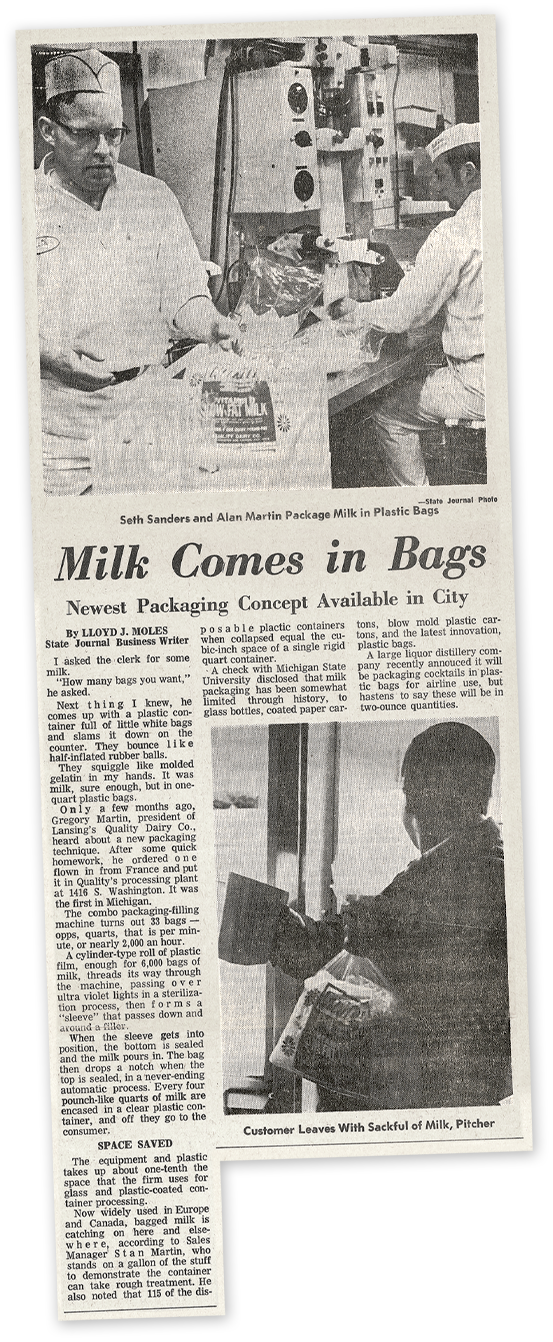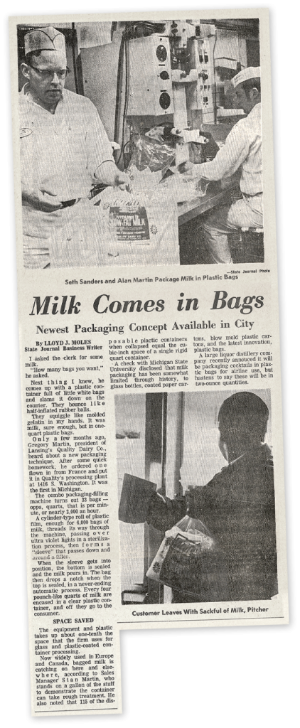 In 1969, becoming known for their innovation in the dairy industry, Quality Dairy introduced their Bagged Milk Pitcher Packs. QD’s Alan Martin & Bob Vanderstow were responsible for bringing bag milk to Lansing. Though the idea originally came from Canada, QD was the first to sell bagged milk here in the United States. QD originally sold their bags of milk in quarts that resembled a small pillow. They soon added half gallons as the new form of milk sales caught on in Lansing. QD’s bagged milk was discontinued in 2000, but many long-time Lansing residents still talk about it fondly.